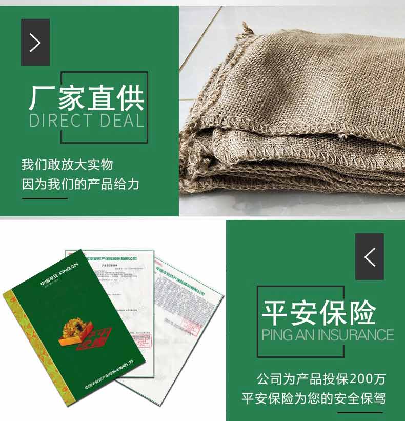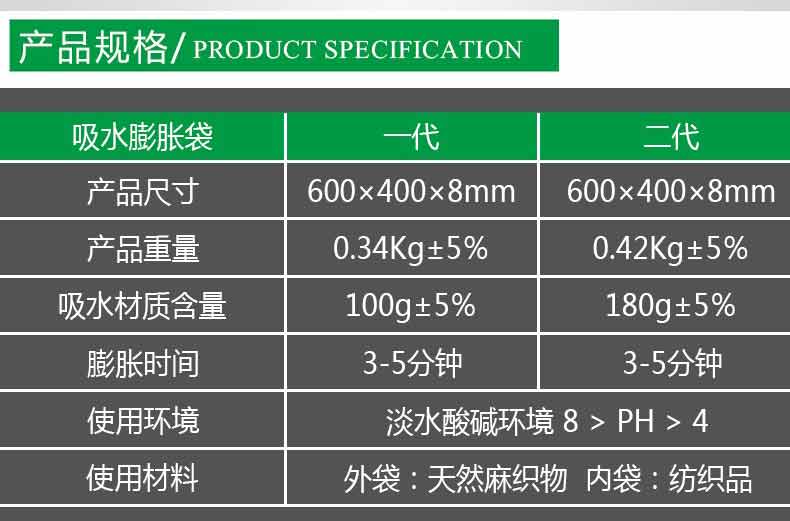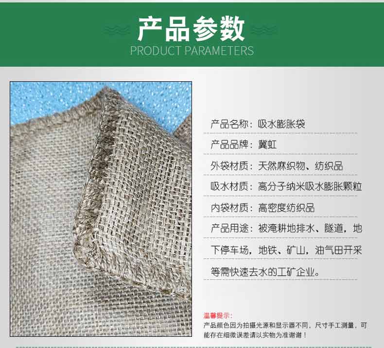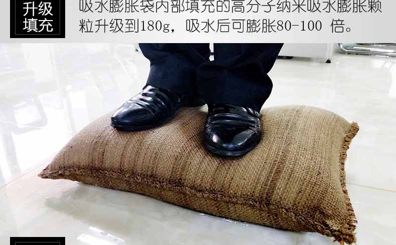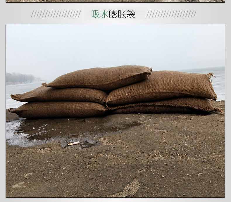 吸水膨脹袋內裝的是新型的高分子納米吸水物質,這種物質無毒、無味、無污染,吸水膨脹前為極小的顆粒物質,吸水后為黑豆大小的含水物質,干凈且無公害,待高分子吸水物質使用后可用于農業保水抗旱,所以在洪水過后可就地將袋內的物質傾倒入農田中,在泥土中可完全分解,是綠色環保、一舉兩得的首選產品。外袋為純麻布和棉布織成,遇水后麻繩可更加結實耐磨。